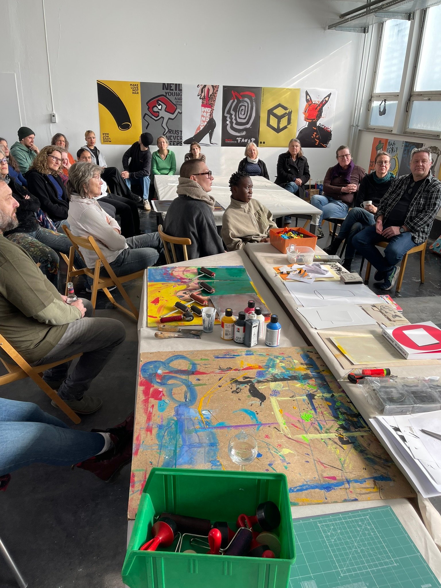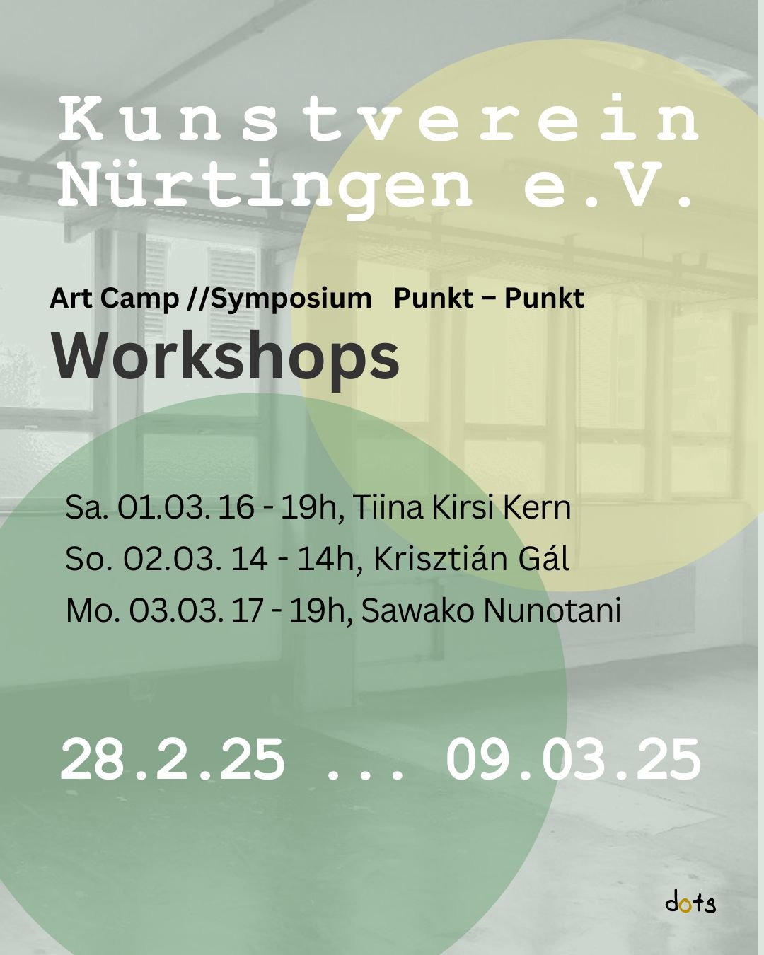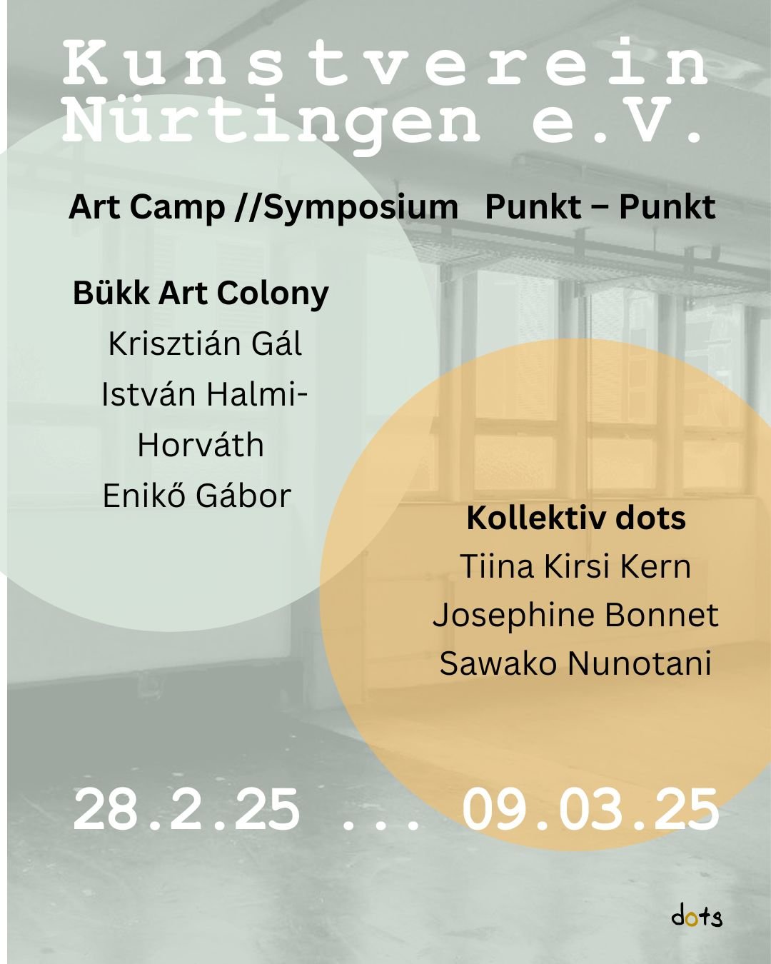 Die Verbindung zwischen diesen beiden Punkten schafft das Art Camp „Punkt-Punkt“ im Kunstverein Nürtingen. Das Art Camp ist über mehrere Tage Plattform für einen künstlerischen, grenzüberschreitenden Dialog. Die Künstler:innen arbeiten vor Ort miteinander, sie gehen mit der Sprache der Kunst in aktiven Austausch. Durch öffentliche Workshops werden Einblicke in die jeweiligen Kunstschwerpunkte gegeben.