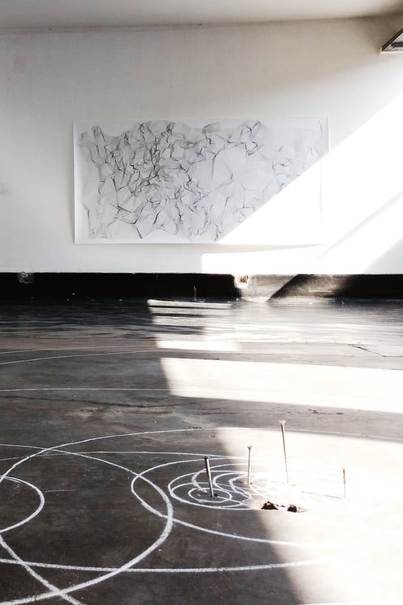 Schrauben, Gewindestangen und Rundhölzer aus einem Sammelsurium der benachbarten Werkstatt werden in die Löcher gesteckt und geschraubt. Strichen nicht unähnlich markieren sie die teils regelmäßig, teils unregelmäßig verteilte Lage der Löcher und stoßen sanft von der Ebene in den Luftraum vor. Der punktuellen vertikalen Stoßrichtung steht eine kreisförmige Ausdehnung in der Horizontalen gegenüber. Die unterschiedlichen Radien werden durch geschlungene Schnüre festgelegt, deren Länge exponentiell zunimmt. Weiße kreis- und ovoidförmige Kreidelinien dehnen sich auf dem dunklen Betonboden in immer größeren Sprüngen aus und mit zunehmender Größe wachsen die einzelnen Zentren zusammen, da die Schlingen nun weit genug sind, um mehrere Ausgangspunkte zu umfassen und zu umfahren.
