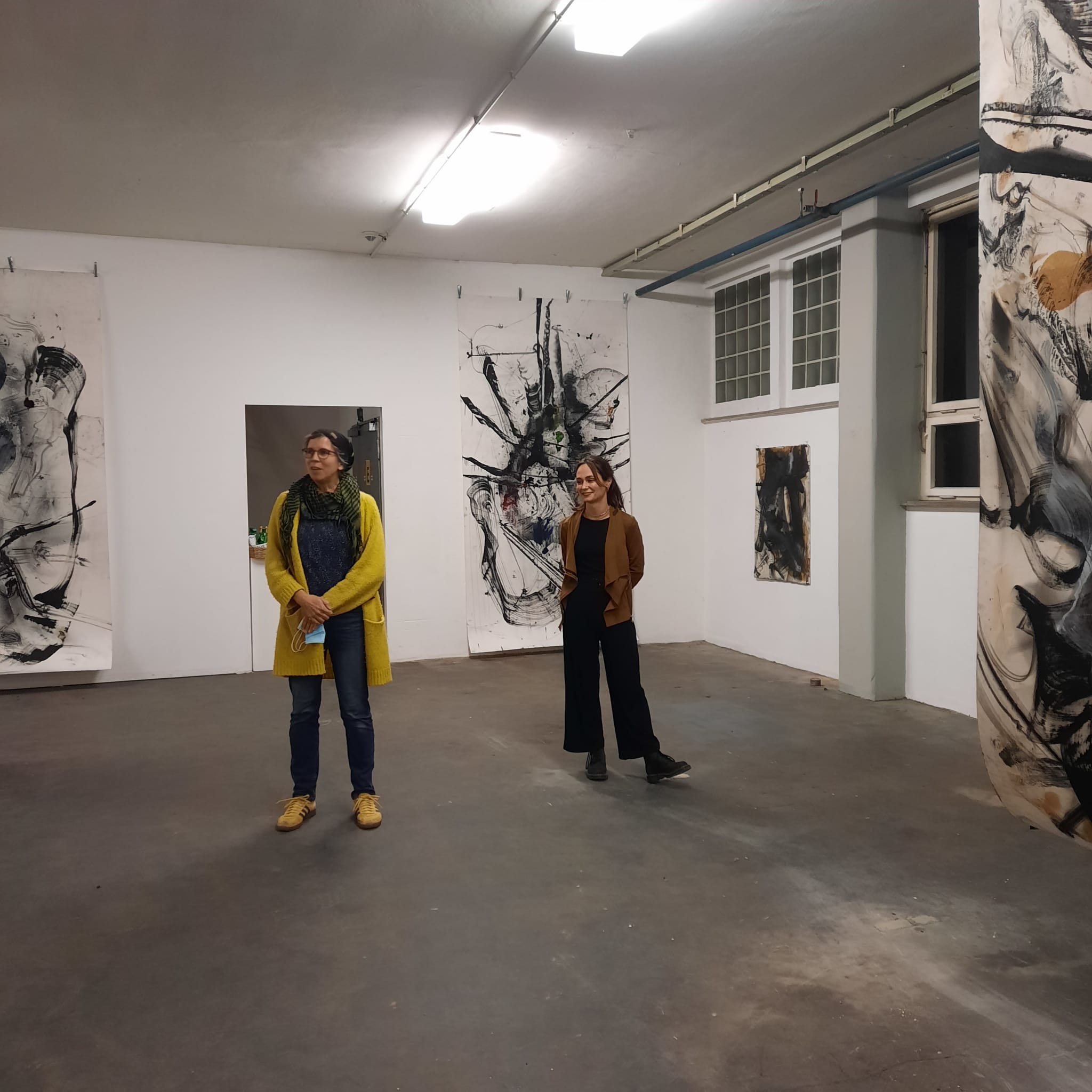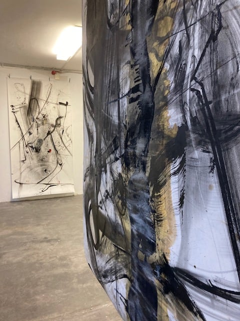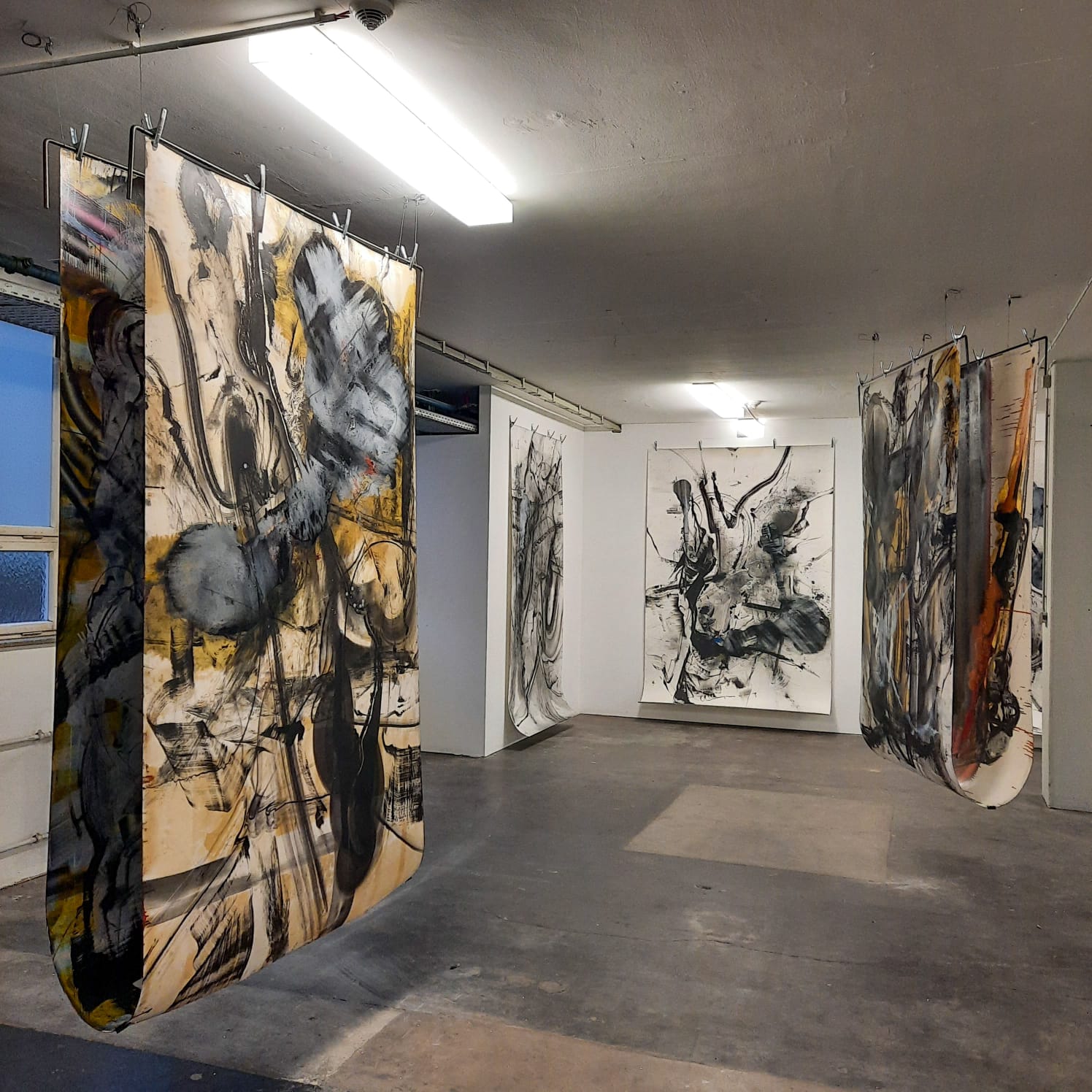 Was beim ersten Betreten dieses Ausstellungsraumes ins Auge fällt, ist die Tatsache, dass wir es nicht mit einer klassischen Hängung und nicht mit klassischen Papierarbeiten zu tun haben. Auch lassen sich die großformatigen Arbeiten zunächst nicht wirklich einordnen. Schwarz, dunkel, fast bedrohlich hängen einige der Papierbahnen von der Decke während andere sich monumental an die Wände des Raumes schmiegen.