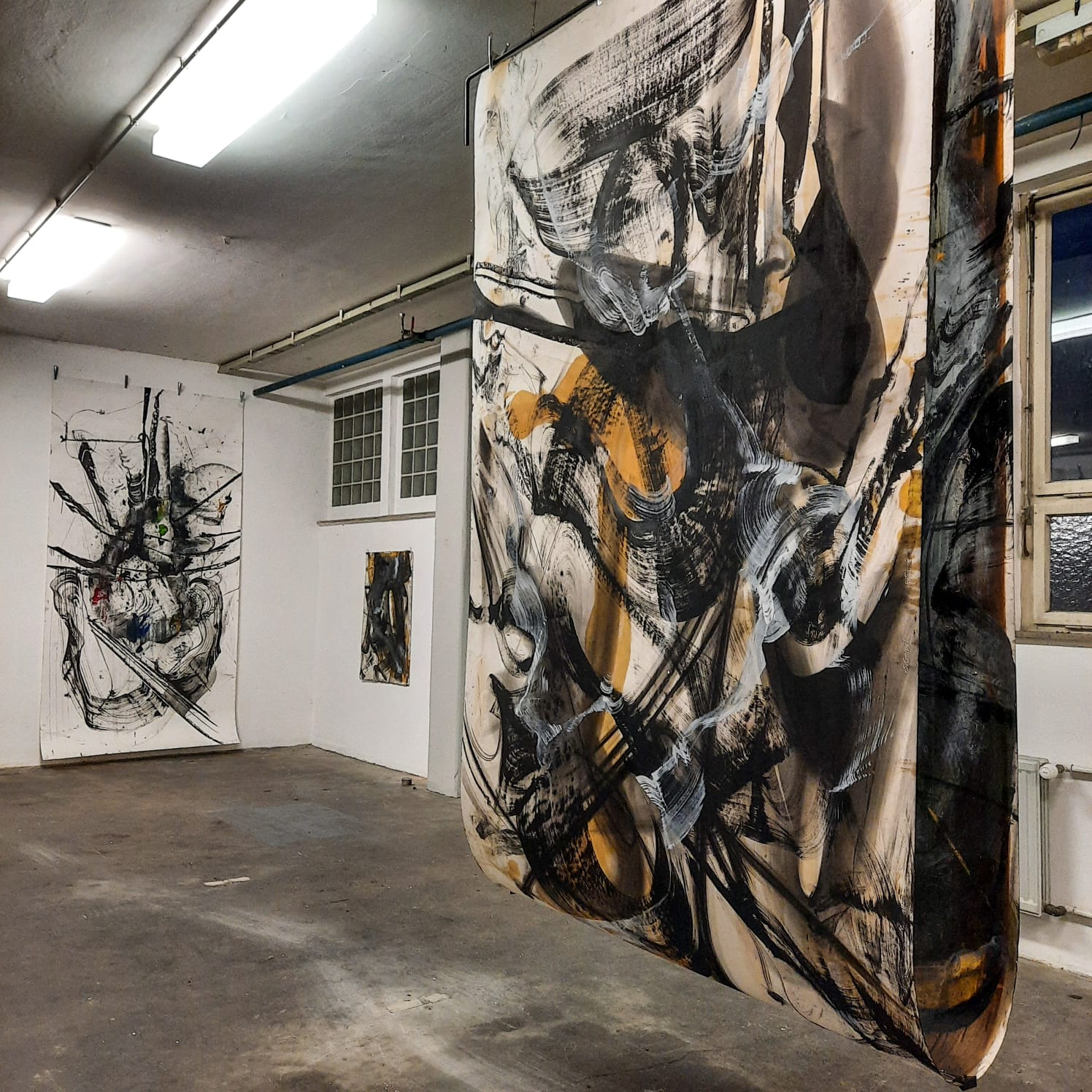 Wir betreten das Atelier durch eine hohe Tür, hinter der sich unmittelbar riesige weiße Rollen auftun, die im ersten Moment nicht wirklich eingeordnet werden können. Mehr oder weniger laufen wir also gegen eine Wand. Es macht sich ein recht durchdringender Geruch bemerkbar, der bereits erste Hinweise auf die verwendeten Materialien gibt. Der Geruch nach frischer Farbe, nur ein wenig beißender, gepaart mit gekochtem Leinöl. Nachdem wir uns zur linken Seite, an den großen Rollen und röhrenartigen Gebilden vorbeigedrückt haben – möglichst ohne etwas zu berühren, schließlich wissen wir, dass wir uns im Atelier des Künstlers befinden – stehen wir nach einigen Schritten vor einer offenen, schwarzen Fläche, die sich zur Rechten auftut. Hinter uns, links neben uns und an der gegenüberliegen Seite werden wir Wänden gewahr, die mit großen und kleinen Arbeiten von Davor Ljubičić behangen sind.